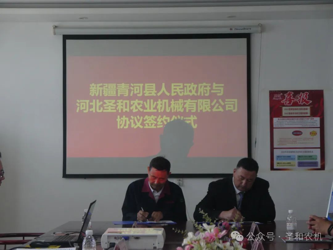 考察結(jié)束后,雙方團隊在圣和公司研發(fā)樓二樓會議室舉行了戰(zhàn)略合作框架協(xié)議簽署儀式。在簽約儀式上,努爾江·薩合塔穆拜主席代表新疆青河縣人民政府,王新芳董事長代表河北圣和農(nóng)業(yè)機械有限公司簽署了戰(zhàn)略合作框架協(xié)議。宋強副書記與王新芳董事長均表示今后一定會精誠合作,實現(xiàn)共贏。