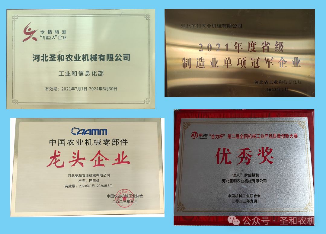 公司被授予國(guó)家級(jí)專精特新“小巨人”企業(yè)、河北省“專精特新”示范企業(yè)、河北省耕作機(jī)械技術(shù)創(chuàng)新中心依托單位、省級(jí)制造業(yè)單項(xiàng)冠軍企業(yè)、河北省首批縣域特色產(chǎn)業(yè)集群“領(lǐng)跑者”企業(yè)名單。身處行業(yè)當(dāng)中,圣和公司積極參與和承擔(dān)行業(yè)、協(xié)會(huì)等發(fā)起各項(xiàng)產(chǎn)品的標(biāo)準(zhǔn)起草編寫(xiě)工作,推動(dòng)了行業(yè)發(fā)展。