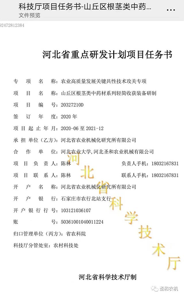 河北省重點(diǎn)研發(fā)計(jì)劃項(xiàng)目:山丘區(qū)根莖類中藥材系列輕簡(jiǎn)收獲裝備研制項(xiàng)目,由河北省農(nóng)業(yè)機(jī)械化研究所有限公司承擔(dān),河北農(nóng)業(yè)大學(xué)與河北圣和農(nóng)業(yè)機(jī)械有限公司為合作單位。 本次會(huì)議河北省農(nóng)業(yè)機(jī)械化研究所所長(zhǎng)范國(guó)昌,河北圣和農(nóng)業(yè)機(jī)械有限公司董事長(zhǎng)王新芳等參加了會(huì)議。會(huì)議明確了工作計(jì)劃進(jìn)度,細(xì)化了工作任務(wù),為項(xiàng)目的順利開展打下了基礎(chǔ)。